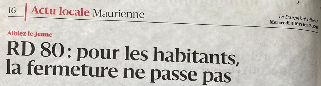 "Par ailleurs, concernant les travaux de réfection de voirie prévus également les 2, 3 et 4 juin sur la RD 110 entre Albiez le Vieux et Saint Jean de Maurienne nécessitant également une fermeture et une déviation par la RD926, les services du Département sont aujourd'hui dans l’impossibilité de confirmer s'ils auront lieu effectivement à cette date, les travaux devant impérativement se faire sans pluie (ils ont déjà fait l'objet d'un report en raison de la météo et un second report n'est pas à exclure). Nous ne manquerons pas de vous tenir informés dès que nous en saurons plus [NDLR : si les deux accès principaux au plateau des Albiez sont fermés simultanément et s'il faut passer par la route des Arves]."